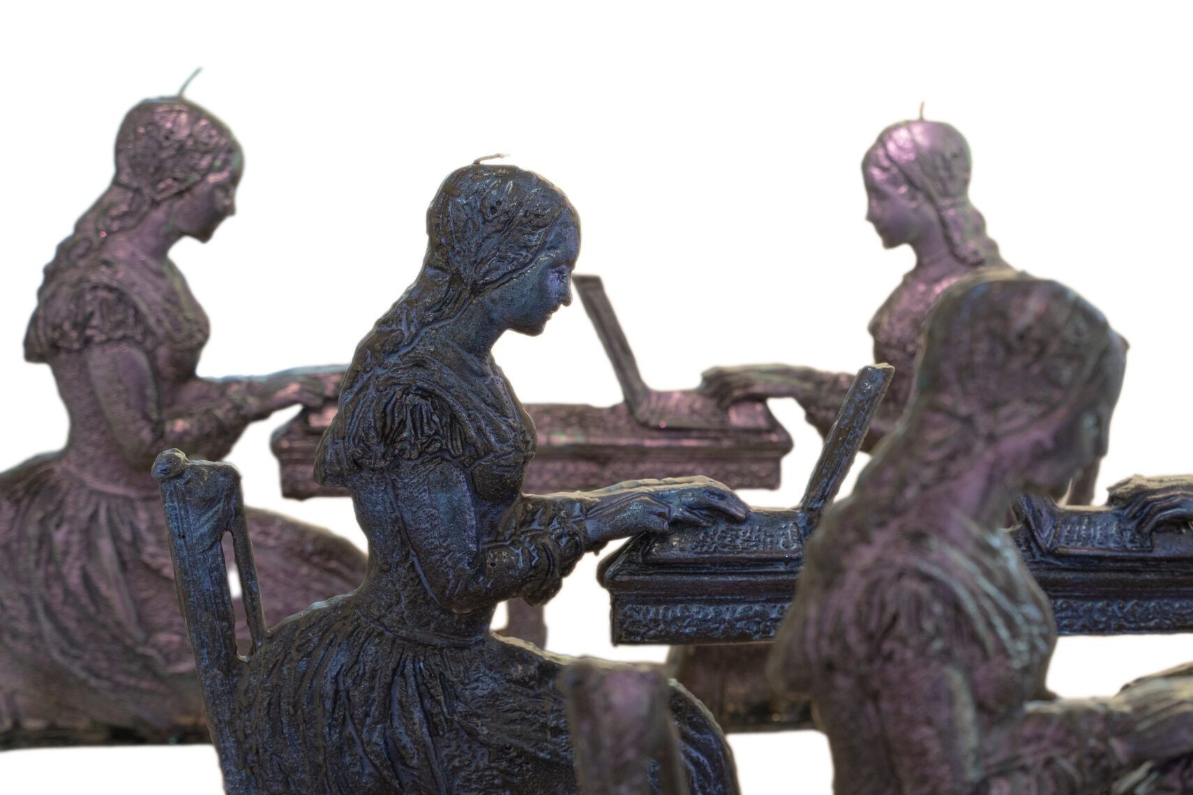 The piece functions as a time-based sculpture. When exhibited, the wax figures are lit, beginning a process of self-consumption over approximately two hours.
